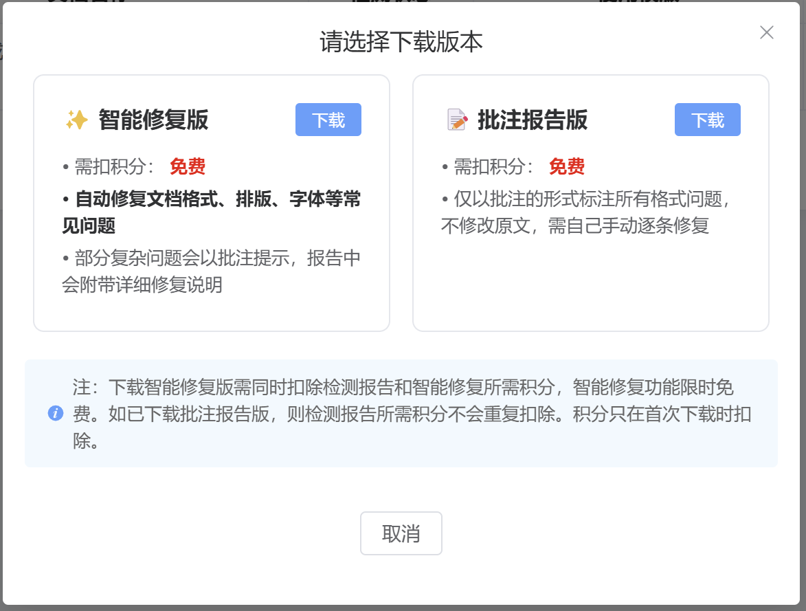 点击“智能修复版”的下载,即可完成下载。如果您想进行对比,也可以下载批注报告版。