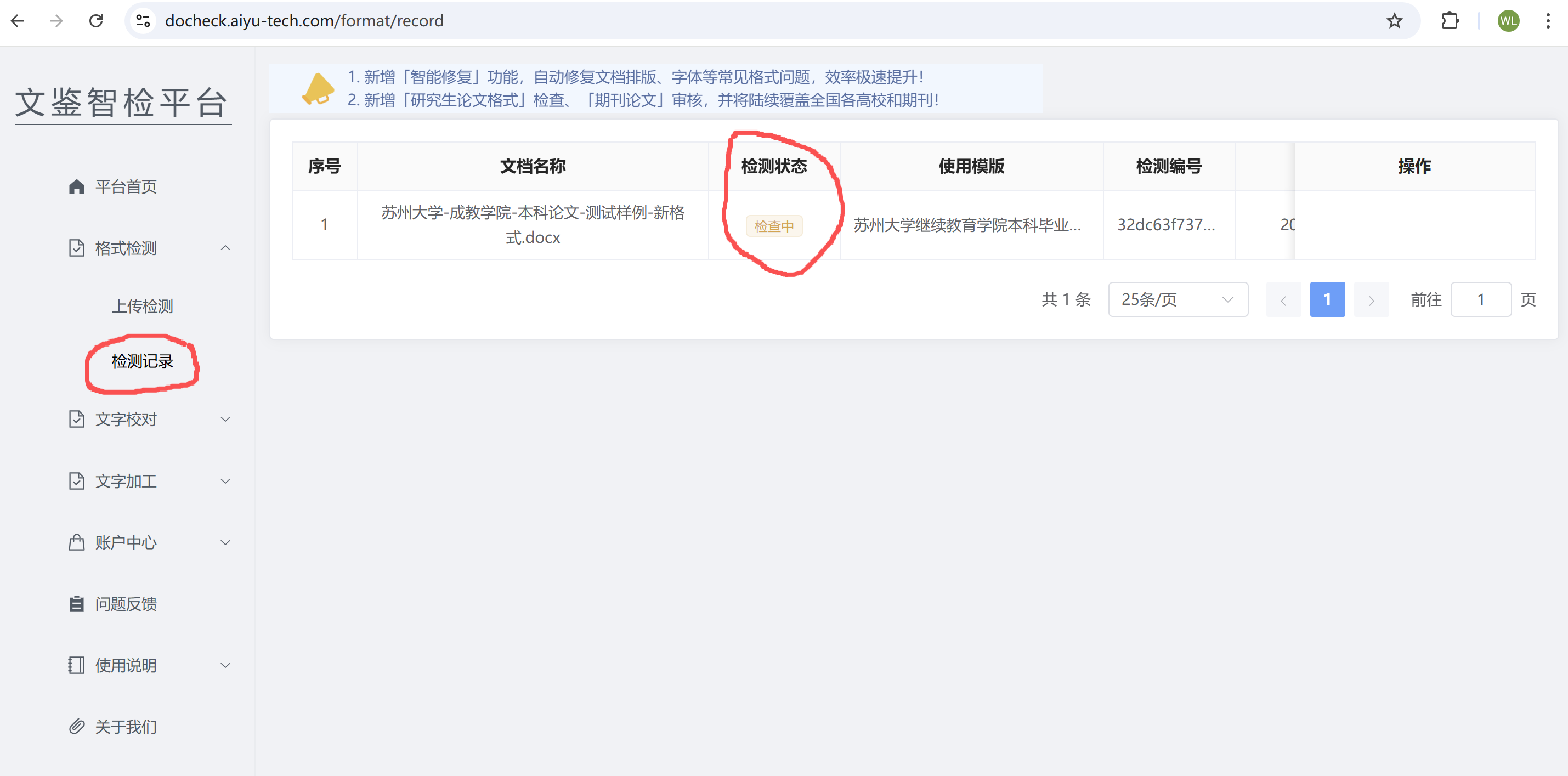 在界面左侧点击“格式检测->检测记录”(见上图左边红框),进入记录功能页面。可以通过“检测状态”查看当前的状态。请稍等1-5分钟(泡杯茶,喝上),直到检测状态变成“检查完成”即可。