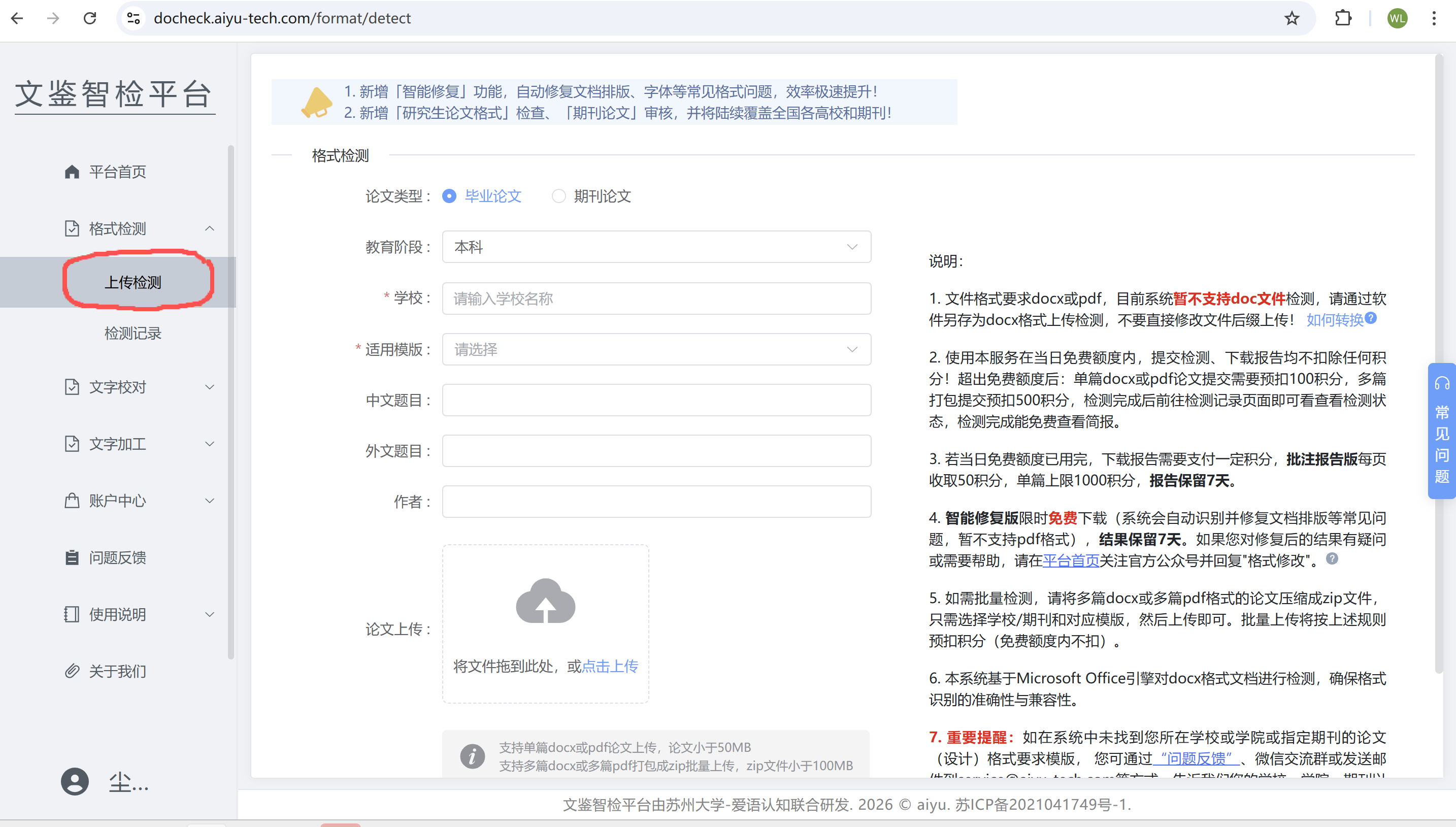 在界面左侧点击“格式检测->上传检测”(见上图红框),进入功能页面。