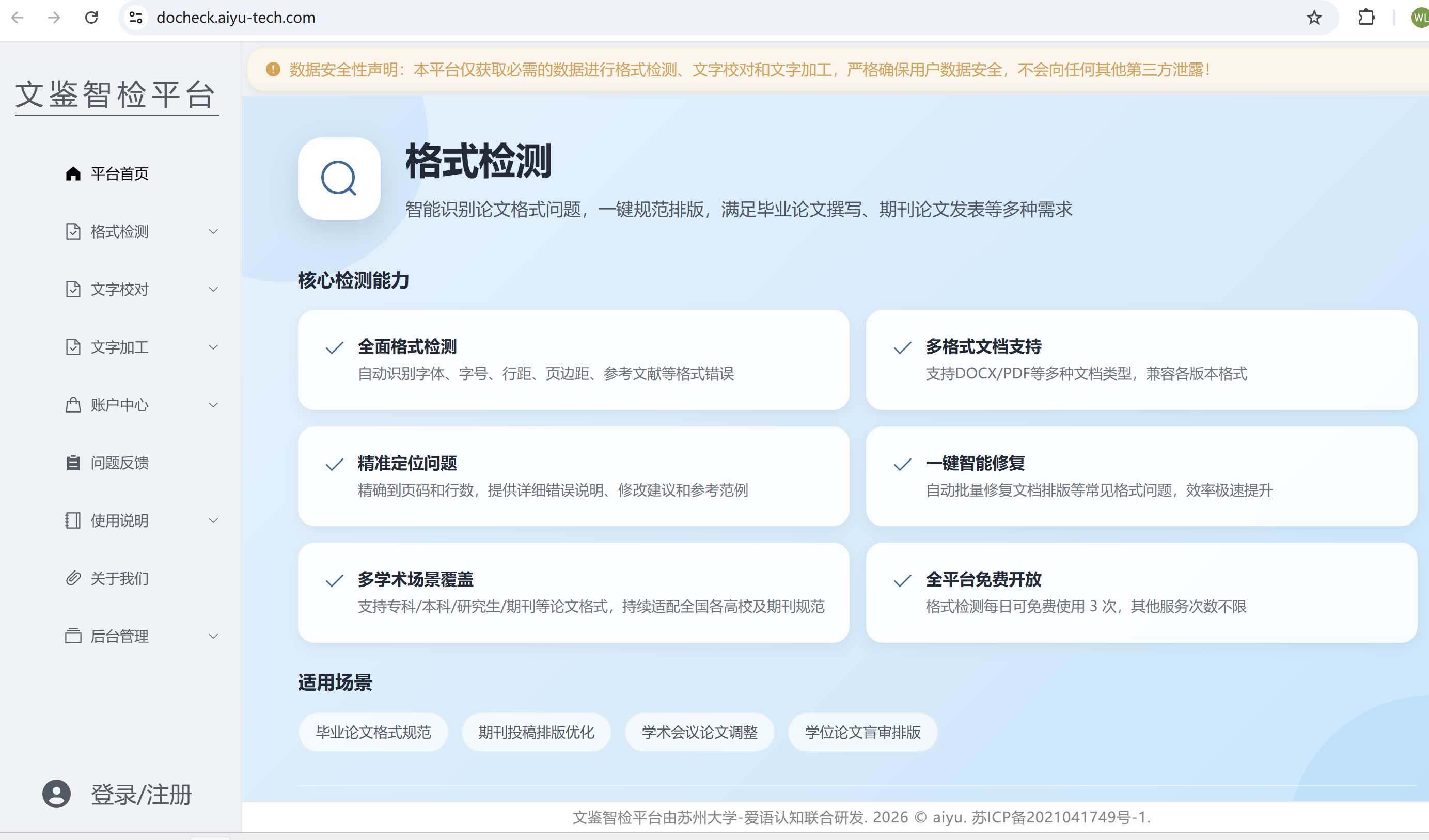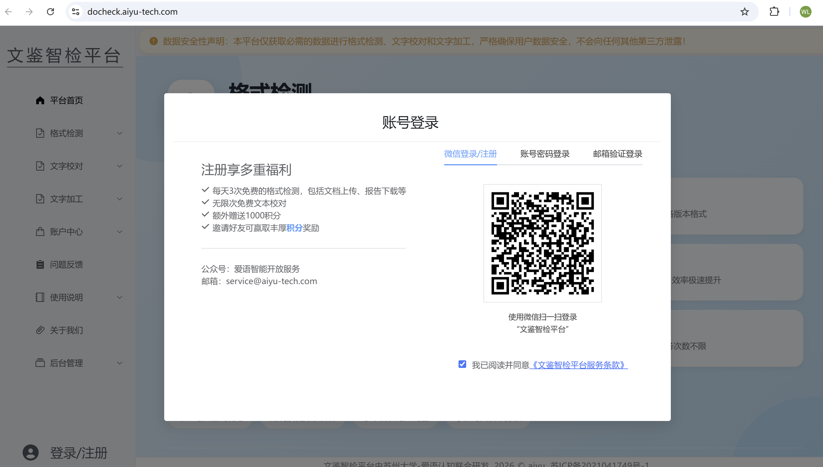 1. 访问平台:打开浏览器,输入文鉴智检平台官方网址(https://docheck.aiyu-tech.com/),进入平台首页;