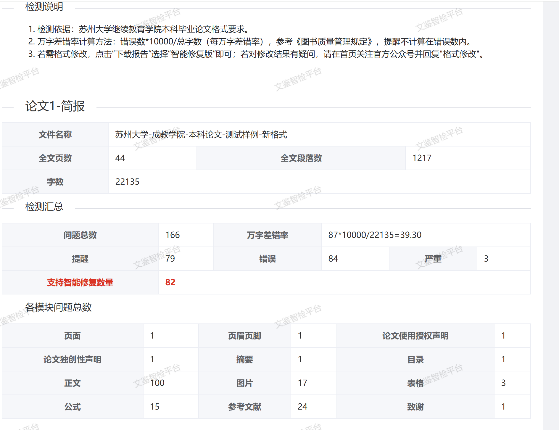 在界面右侧点击”查看简报“。下图就是简报样例,该论文有166处错误,其中82处已被“智能一键修复”。