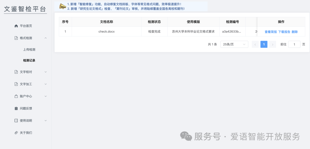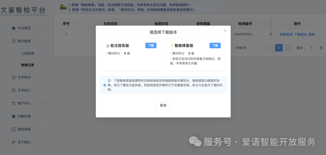 ● 在「格式检测-检测记录」中点击“下载报告”下载检测结果报告(可选批注报告版或智能修复版)。